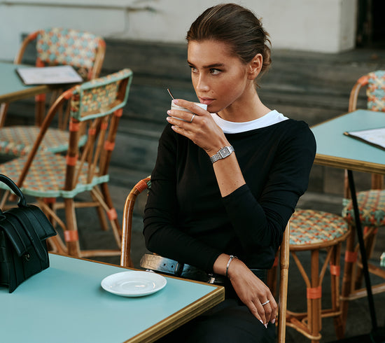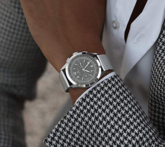 Chrono 39 Porto Cervo Chrono 39 Porto Cervo  En rund herrklocka i rodiumpläterat silver från WALDOR & CO. med svart sunray urtavla och en sekundvisare. Seiko urverk. Modellen är Chrono 39 Porto Cervo.