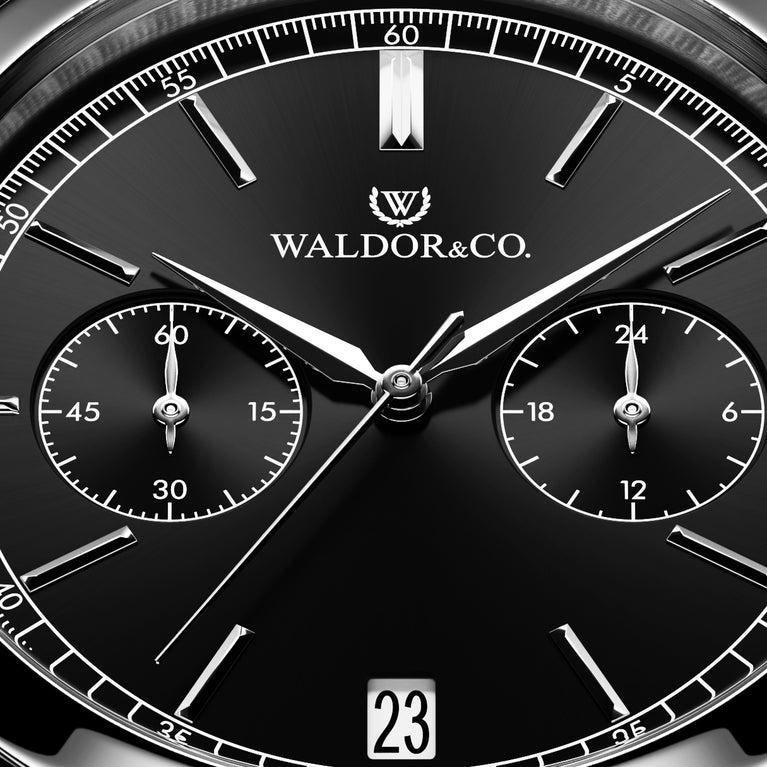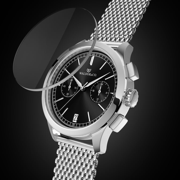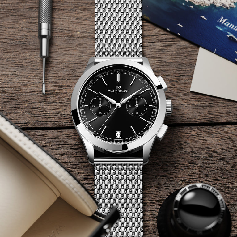 The Chrono 39 Sardinia presents a captivating black dial, embodying a classic and versatile elegance. The black color is of a deep, rich tone that provides a striking contrast against the vibrant stainless steel case and mesh bracelet, making for a sophisticated monochromatic palette.